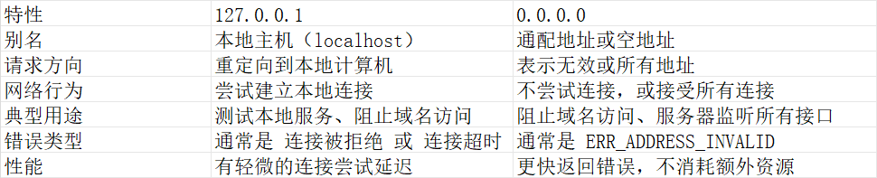 将请求重定向到本地,可模拟访问失败或“连接被拒绝”,适用于需要测试或验证的场景,对于需要模拟访问失败或本地测试则使用 127.0.0.1,更灵活。